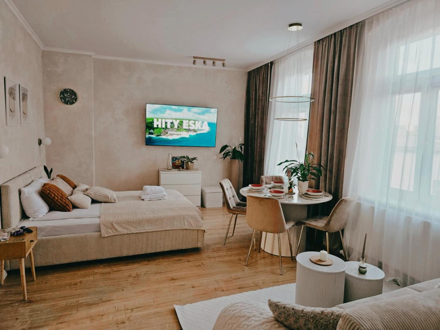 Apartament typu studio z łóżkiem podwójnym. This apartment is comprised of 1 living room, 1 separate bedroom and 1 bathroom with a shower and free toiletries. Meals can be prepared in the kitchen, which is fitted with a stovetop, a refrigerator, a dishwasher and kitchenware. This apartment features a tea and coffee maker, flat-screen TV with streaming services, ancourtyard view, as well as chocolate for guests. The unit offers 1 bed. Apartament - 2 osobowy. Powierzchnia pokoju ok.: 20 mkw. ;